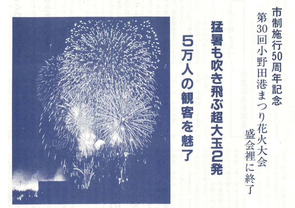 小野田みなと祭り花火大会は、1960年(昭和35年)の初開催以来、2005年(平成17年)に「山陽小野田市」が誕生した翌年の2006年(平成18年)が最後の開催となりました。その間、全部で45回開催され、旧小野田市を代表する夏の観光行事として、地元市民の皆様に愛されました。